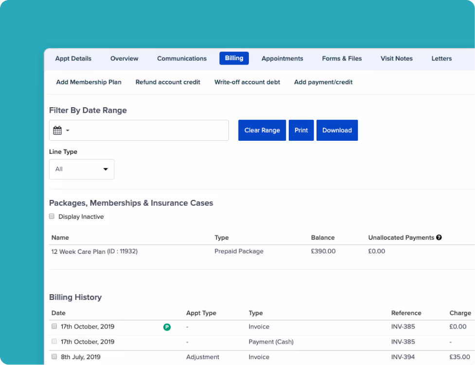 With our super useful pre-paid packages feature managing a patient's packages has never been easier. Create customisable pre-paid packages to apply to a patient. These packages are then automatically used when a patient visits. A running balance and visit total are shown to allow you to see at a glance the finer details of their package.